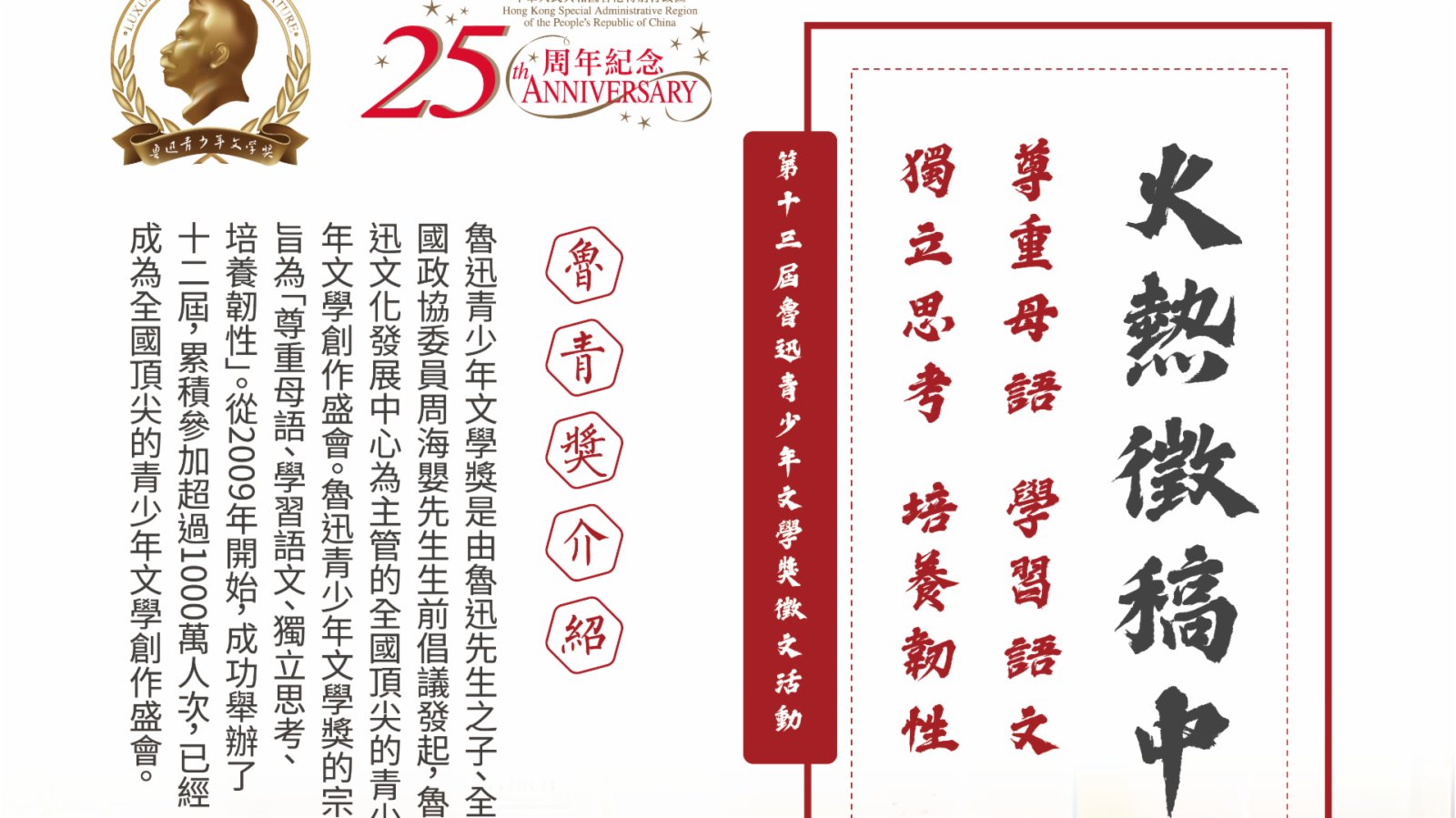 第十三屆魯迅青少年文學獎香港賽區寫作比賽是一項慶祝香港特別行政區成立二十五周年的認可活動,旨在發現並培養優秀的香港青少年文學創作者。魯迅青少年文學獎以「尊重母語、學習語文、獨立思考、培養韌性」為宗旨,是全國頂尖的青少年文學創作評選活動。