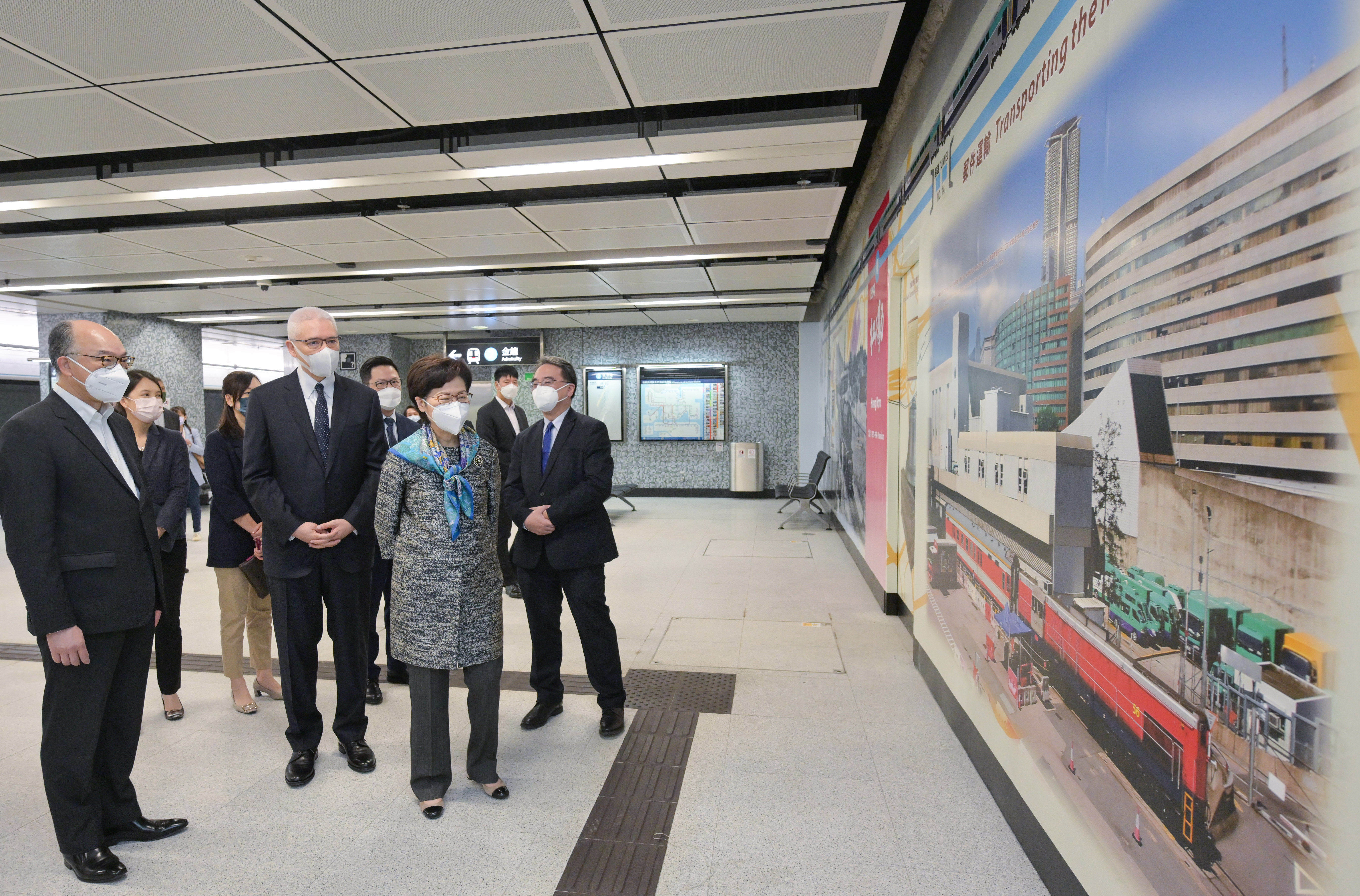 大公文匯全媒體報道,行政長官林鄭月娥今日(4日)到灣仔北視察東鐵綫過海段新建的會展站,了解東鐵綫過海段本月15日通車的準備工作,並參觀鄰近為配合該鐵路工程而須重置的設施。