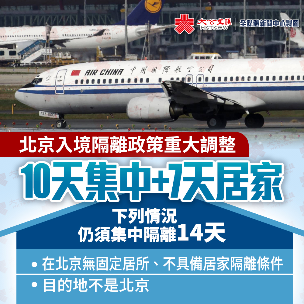 大公文匯網綜合報道,北京今日(4日)召開疫情防控新聞發布會,北京市政府新聞發言人徐和建表示,根據奧密克戎(Omicron)變異株潛伏期短、臨床症狀較輕的特點,首都嚴格進京管理聯防聯控協調機制決定,調整北京有關風險人員隔離管理措施,入境口岸為北京的,調整為實施「10天集中隔離+7天居家隔離」。