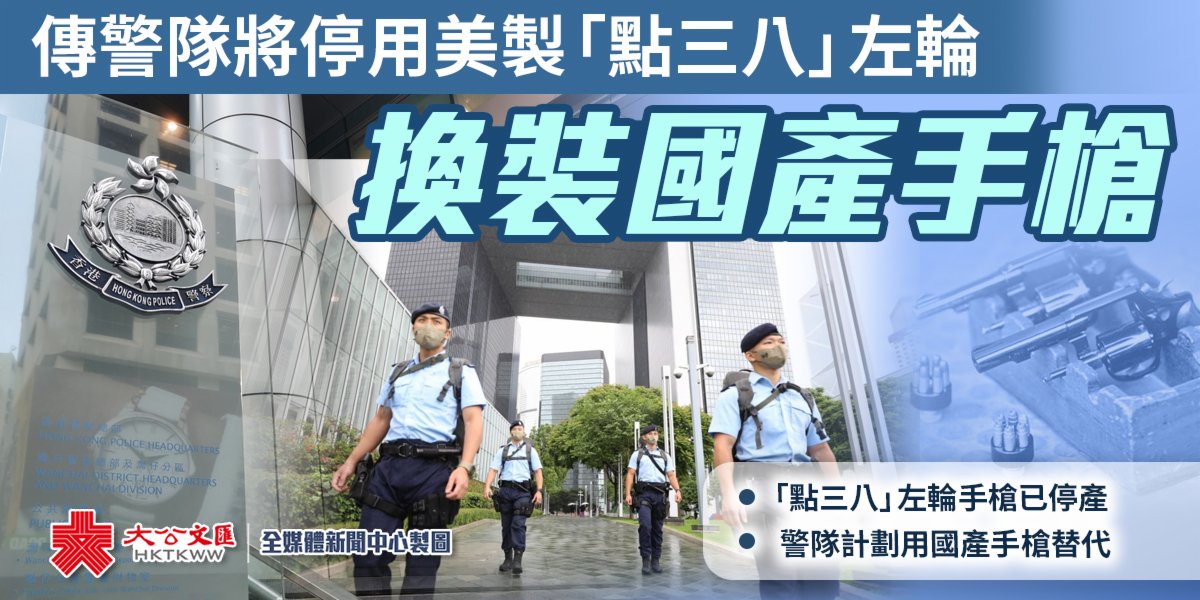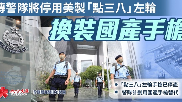 大公文匯全媒體報道,香港警隊具標誌性的「點三八」左輪手槍將被淘汰。消息指,基於美國製史密夫威遜10型(Smith & Wesson Military & Police)「點三八」左輪手槍(S&W M10 Revolver)已停產,警隊已落實「換槍計劃」,敲定轉用國產手槍替代,但由於涉及採購、訓練等程序,警隊需時逐步更替。