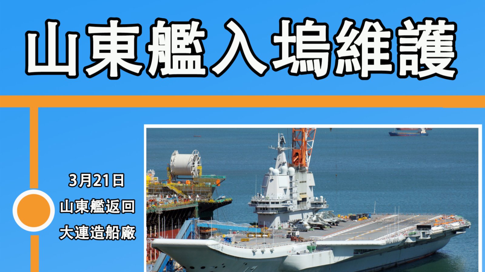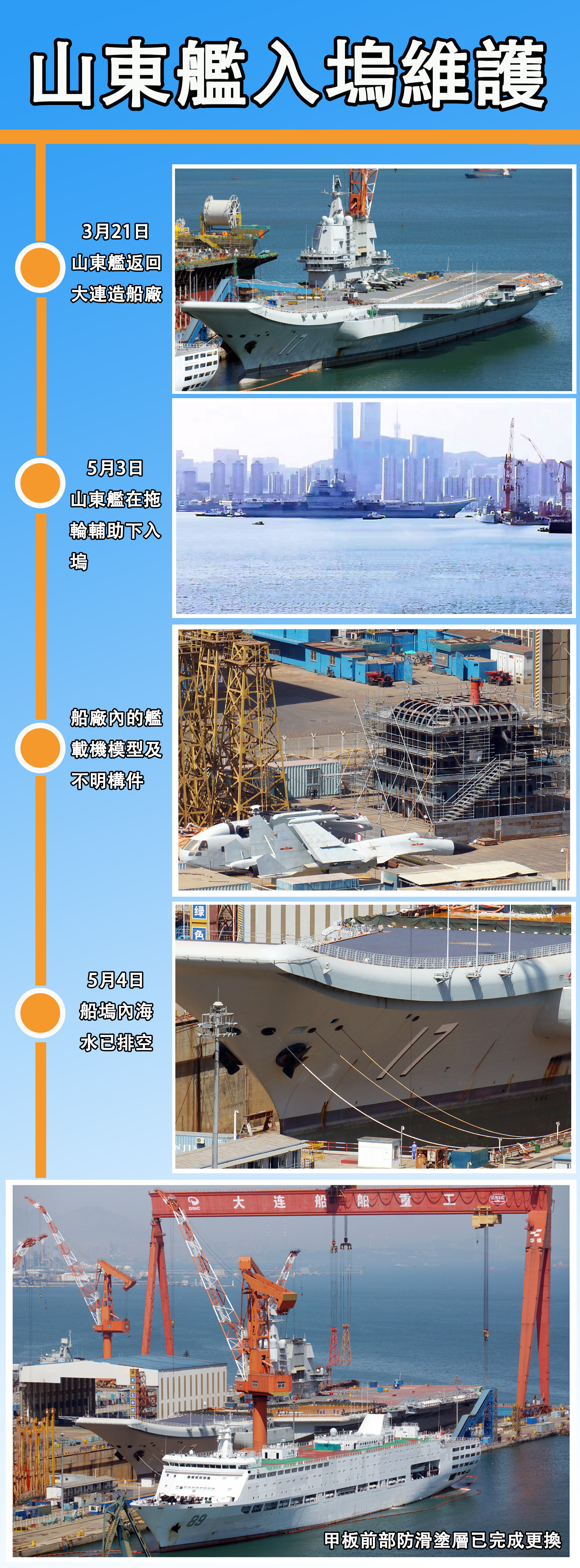 大公文匯全媒體報道,按照海軍例行安排,中國首艘國產航母山東艦3月21日返回大連造船廠,進行首次計劃內可用性提升維護。山東艦抵大連後初時靠泊在船廠碼頭,並開始重新鋪設航空甲板防滑塗層。至5月3日,山東艦在拖輪的輔助下入塢,原先擺放在山東艦航空甲板上的艦載機模型經已卸載。目前,船塢內的海上經已排空。參照遼寧艦,山東艦首次計劃內可用性提升維護將對航母的動力、武器等各系統進行全面檢修保養,預計將持續約半年時間。