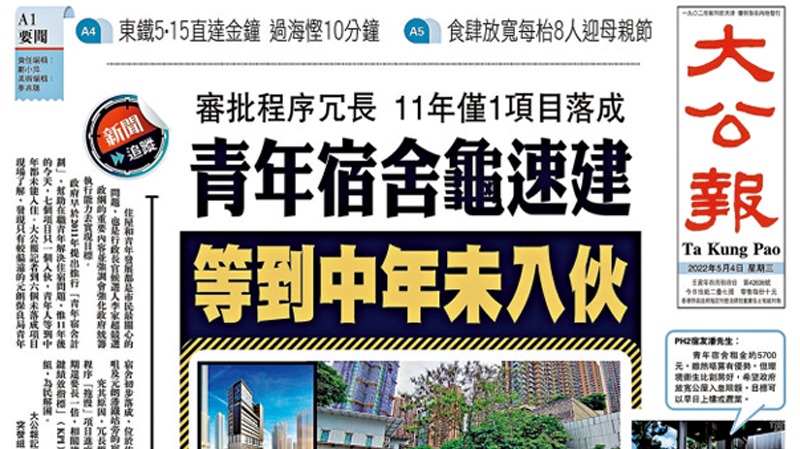 【大公報記者 楊州】《大公報》昨日報道「青年宿舍計劃」推出11年,七個項目只一個入伙,冗長繁複的審批及撥款等行政程序大大「拖慢」進度,引起廣泛關注。