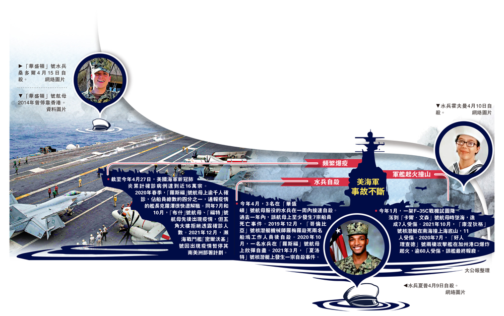 •今年4月,3名在「華盛頓」號航母服役的水兵在一周內接連自殺。過去一年內,該航母上至少發生7宗船員死亡事件。2019年12月,「哥倫比亞」號核潛艇機械師羅梅羅殺死兩名船塢工作人員後自殺。2020年10月,一名水兵在「羅斯福」號航母上飲彈自盡。2021年3月,「夏洛特」號核潛艇上發生一宗自殺事件。