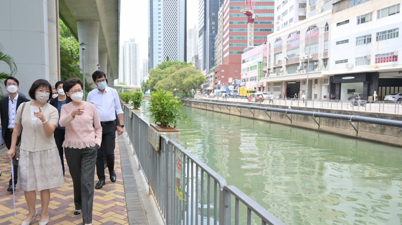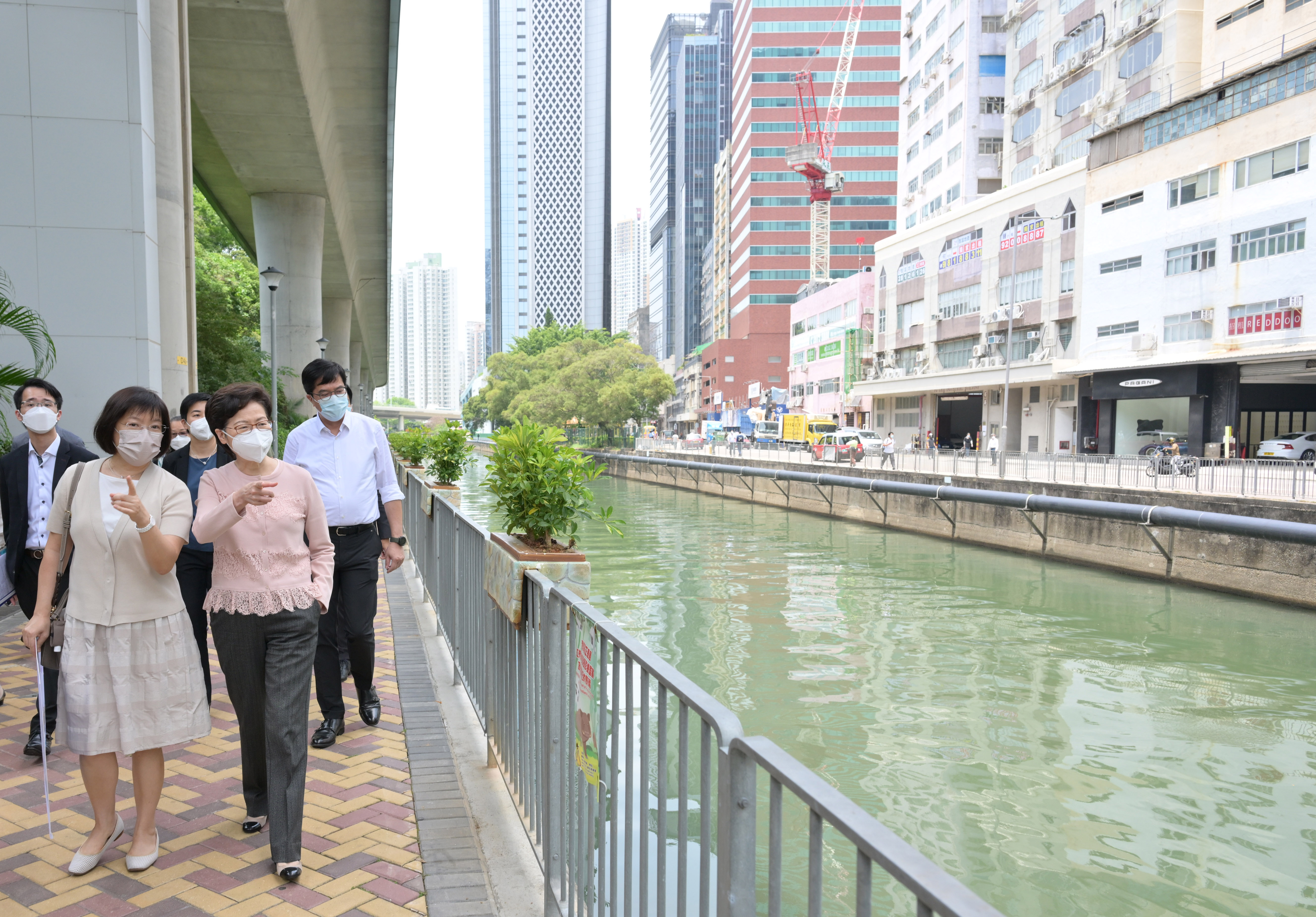 其後,林鄭參觀涌尾明渠及毗鄰公共空間,聽取區潔英介紹明渠活化項目和兩項「地方營造」項目計劃,即重塑大王爺廟毗鄰公共空間,包括重鋪地面和提供長椅及壁畫,以成為居民日常休憩和社交聚腳點,以及建設「黃竹坑綠色連線」,通過具吸引力的休憩處和便捷的行人設施,連接港鐵黃竹坑站和香港仔郊野公園。