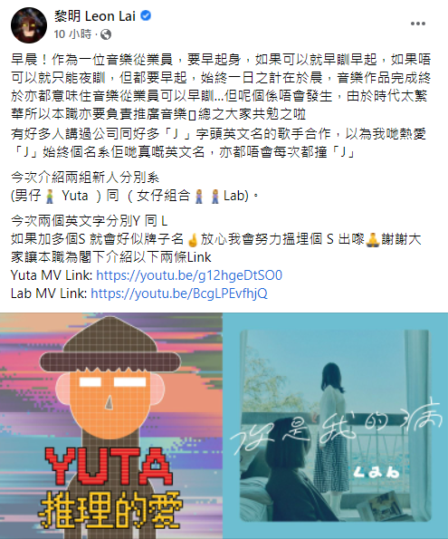(大公文匯全媒體記者陳惠芳報道)香港樂壇近來多了新晉歌手,作為Amusie老闆的黎明,旗下同樣栽培新人。黎明今早(5日)在Facebook出post宣傳旗下2組新人Yuta同埋Lab。