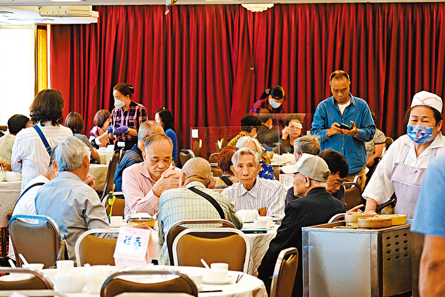 現年89歲的陸先生及71歲的鄭先生昨日一行6名「老友記」到酒樓品茗。他們都是該酒樓數十年的常客,陸先生笑說:「我睇住蘇萬誠(酒樓副總經理)大!我兒子當年結婚便在這裏擺了58圍。」他表示,能夠與一眾由細玩到大的朋友同枱飲茶而不用分枱,感覺熱鬧很多,亦更盡興。鄭先生亦說,疫情前一班朋友每周相約兩三次到該酒樓飲茶,有時之後更直落麻雀耍樂,已成為生活一部分,疫情期間被迫叫停。