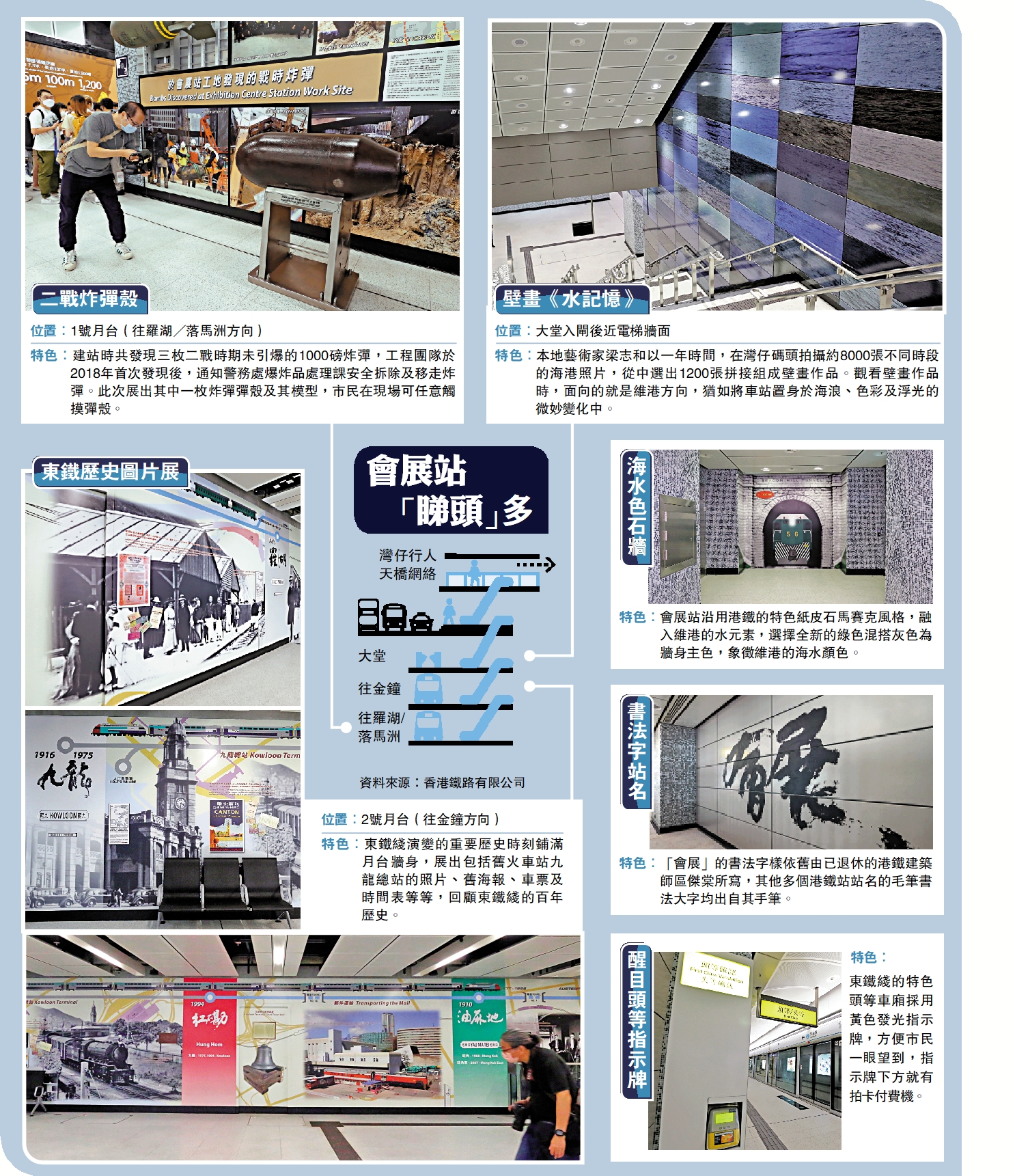 新車站有三大必到「打卡」景點不容錯過,包括建站期間挖到的二戰時期未引爆千磅炸彈、東鐵綫的百年歷史演變圖片,以及逾千幅維港海浪相片拼接組成的巨型壁畫,非常有特色。