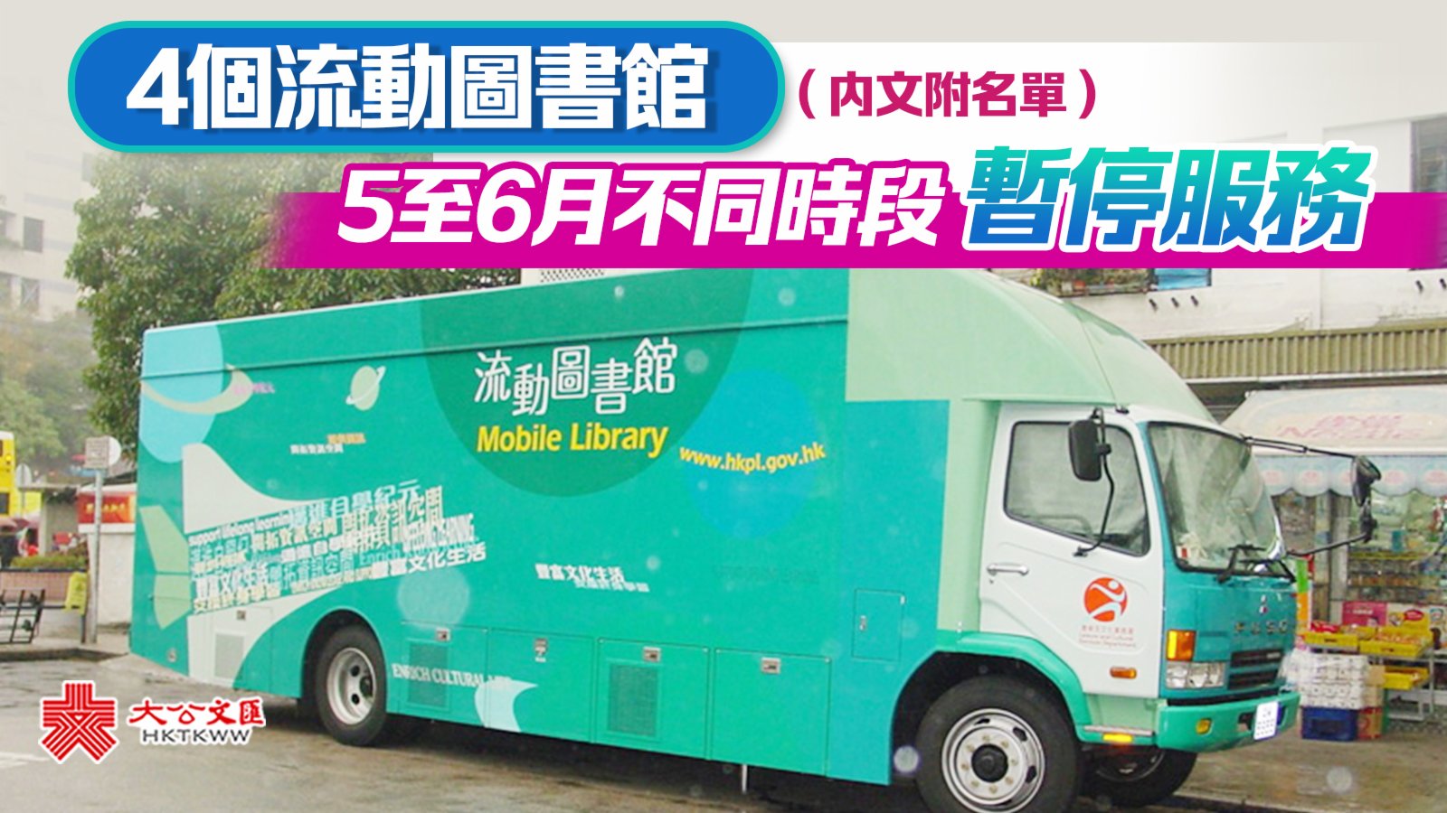 大公文匯全媒體報道,康文署發言人今日(6日)宣布,流動圖書館一、六、八及十二將於5月及6月不同時段暫停服務,以便進行例行保養維修工程。