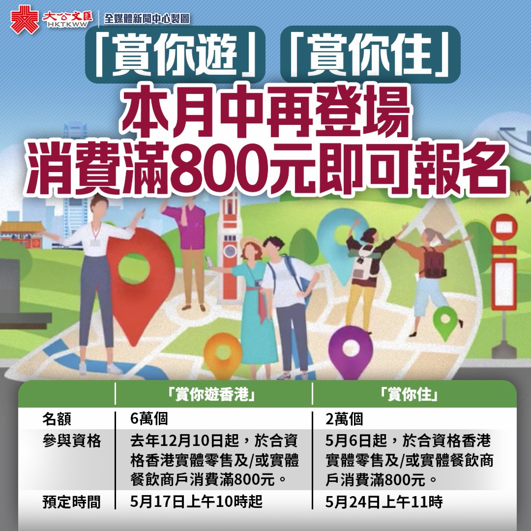 是次「賞你遊香港」的名額有6萬個,包括約300個行程,首批報名時間將於5月17日上午10時開始,市民可直接向旅行社報名。而「賞你住」則有2萬個名額,約有100間酒店參與,市民在5月24日上午11時起可透過酒店指定電郵,或酒店網站以推廣碼「HKstay」直接向參與酒店預訂。