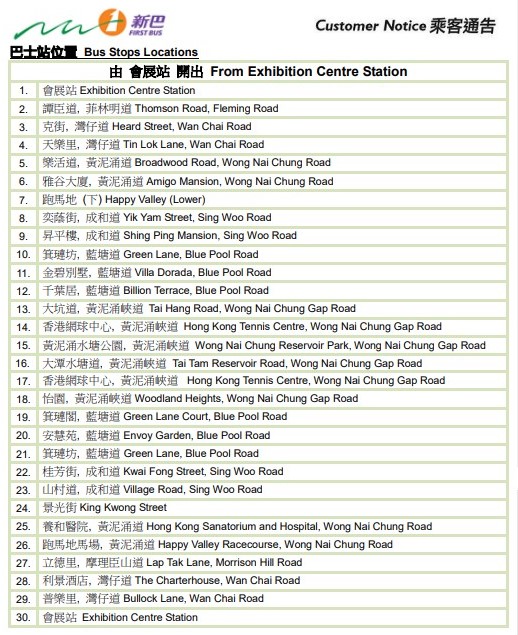 此外,現時位於灣仔北的臨時總站,將於本月14日起遷移至會展站公共運輸交匯處。以下路線將於當日起,轉為使用該站: