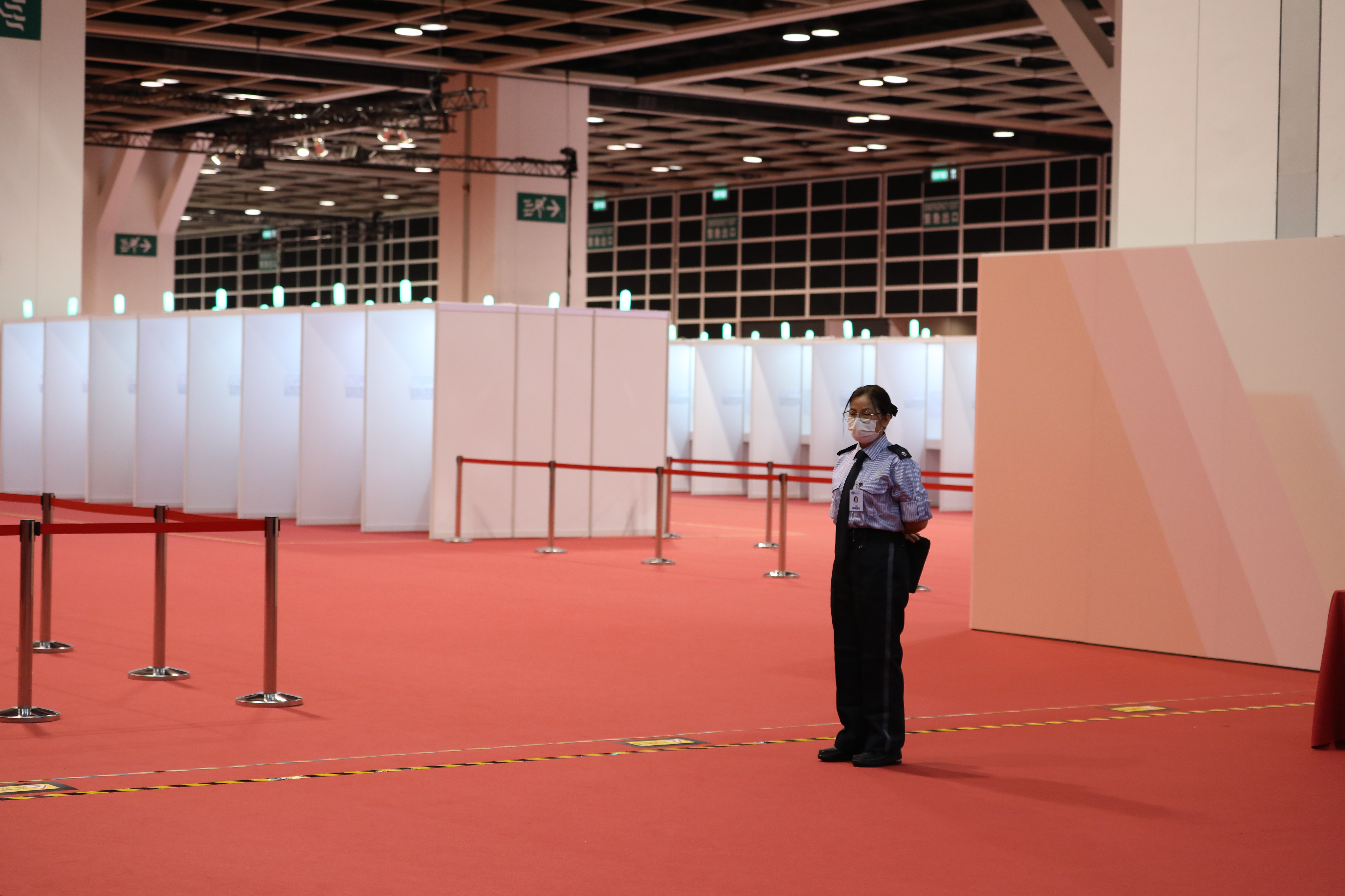 大公文匯全媒體記者今日於灣仔會展投票中心發現,現場布置已經大致完成,而工作人員亦正在為明日的選舉作最後準備。