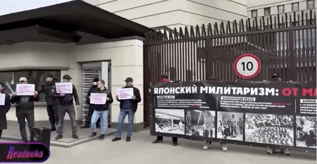 當地時間5月6日上午,在位於莫斯科格羅霍爾斯基巷的日本駐俄羅斯大使館外,一群俄羅斯人用橫幅和標語牌提醒人們勿忘日本人曾犯下的罪行。