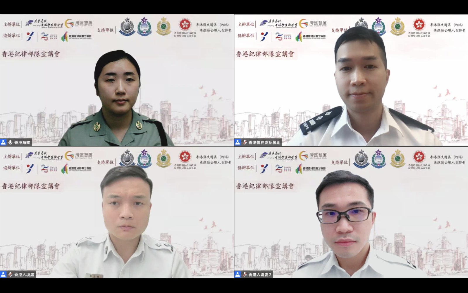 活動邀請香港各紀律部門成員以在線宣講的形式,為在粵香港學生和青年介紹各紀律部隊的理念和架構,及相關職系報考條件、遴選程序及相應範疇的工作內容,也說明了不同職系的薪酬福利和晉陞階梯。同時,也邀請在粵高校畢業的現任香港紀律部隊人員分享,為在粵香港學生和青年「指點迷津」,讓在粵香港青年更了解香港紀律部隊的工作情況。