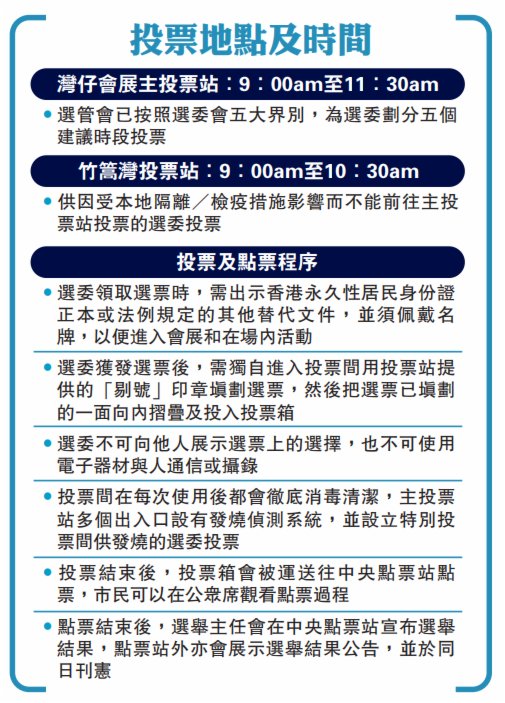 本次選舉投票時間會延長至兩個半小時,為8日上午9時至11時30分;選舉主投票站設於會展中心,會使用電子選民登記冊系統發出選票,以期令發票工作更有效率和準確。考慮現時香港疫情,選舉事務處在竹篙灣社區隔離設施設立投票站。