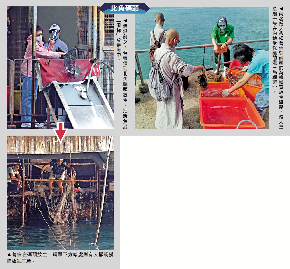 大公報記者近日在北角碼頭直擊,善信在上面放生,有人在下面即時截撈。有市民建議與其「倒錢落海」,不如捐錢資助派飯或派物資予有需要的人,真正行善。