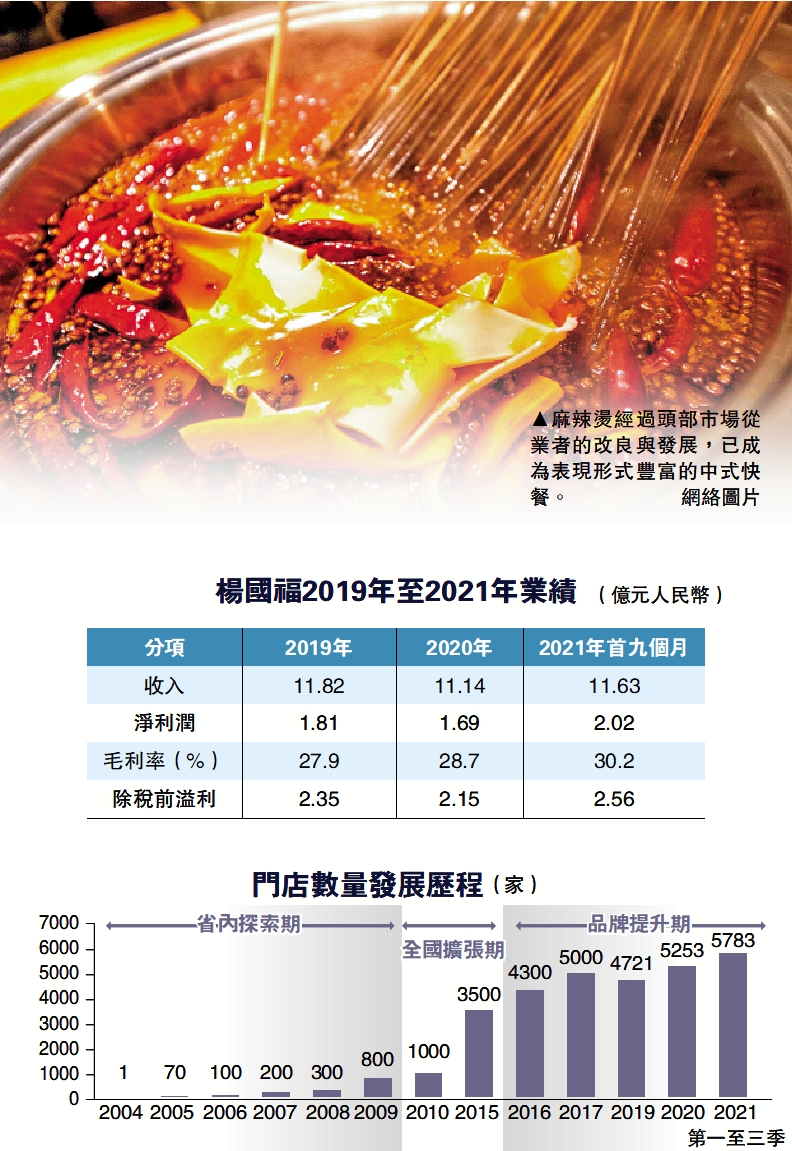 去年開始,楊國福積極多元化,拓展零售產品,將「即食、即熱、即烹」的理念融入品牌和產品。截至去年9月底止,公司已推出16款零售產品,包括括麻辣燙自熱鍋、多人份自熱大火鍋及火鍋湯底料等。去年首9個月錄得相關收入3720萬元,減輕公司因疫情帶來的負面影響。