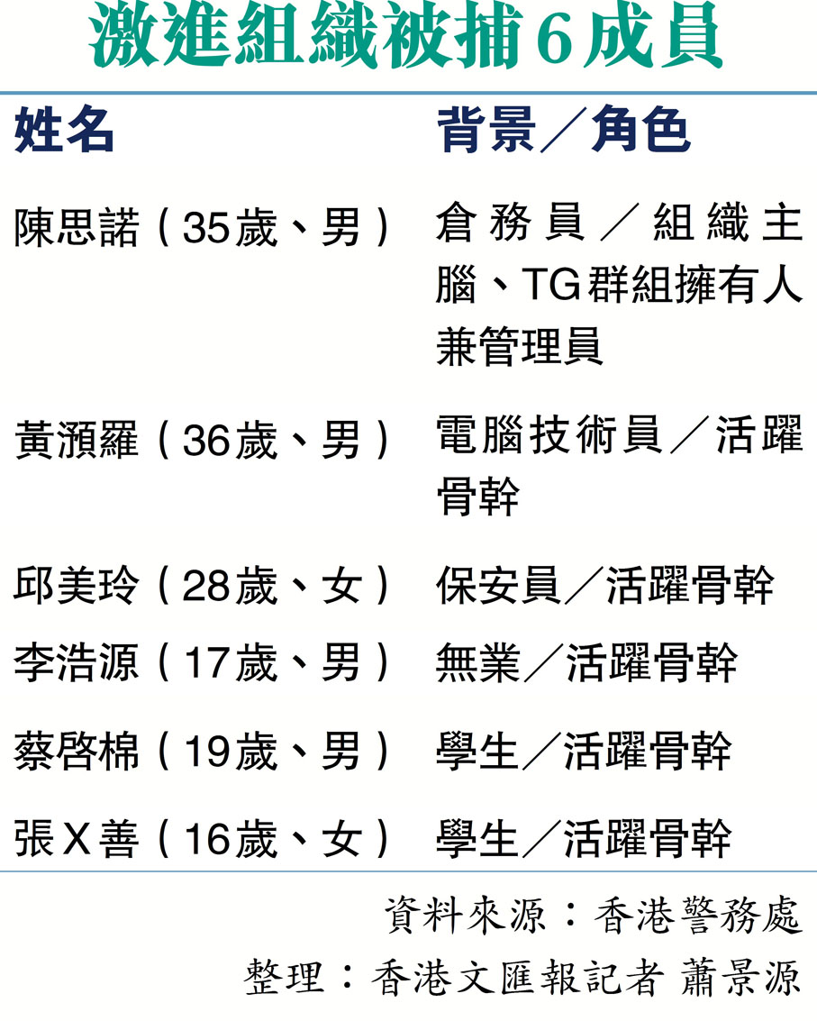 被捕6人分別4男2女,年齡介乎16歲至36歲,包括主腦即群組擁有人兼管理員,以及活躍成員,部分人有刑事案底,各人分別任職倉務員、電腦技術員、保安員、學生及無業者。