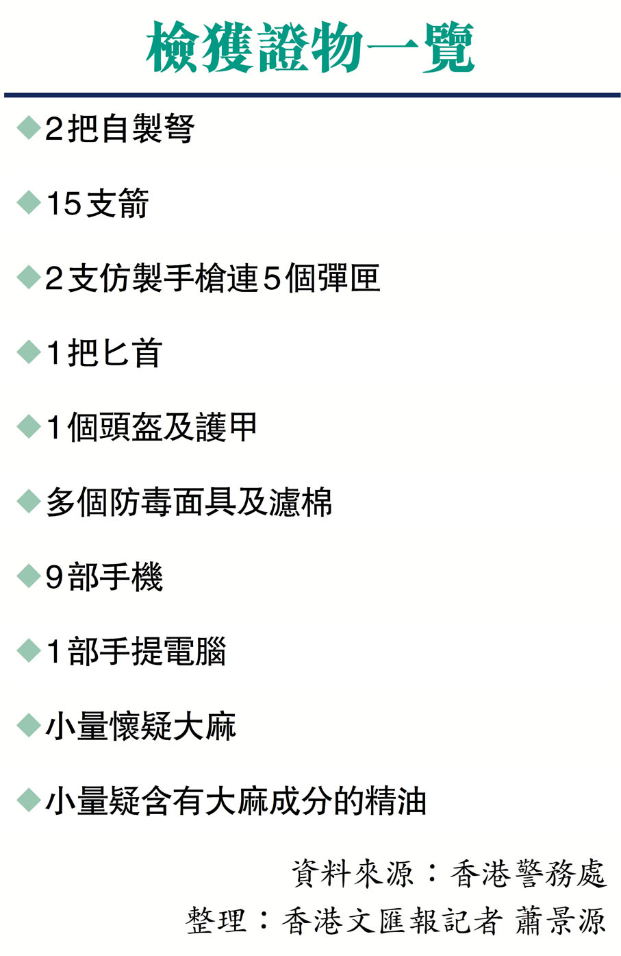 上周六(7日),網罪科探員認為時機成熟,突擊搜查全港多個目標地點,拘捕該激進組織的主腦及骨幹成員共6人,並檢獲一批手提電話、手提電腦、仿製槍械、自製弩、箭、匕首、小量懷疑大麻及含有大麻成分的精油等證物。