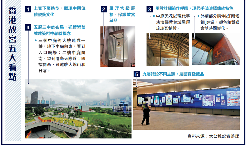 香港故宮文化博物館正進行開幕前最後準備工作,內部裝潢及設施昨日首次曝光,九個展廳分布五個樓層,三個不同方向的中庭各有「睇頭」。由北京故宮博物院借出的900多件珍貴文物,將陸續抵港,「打頭陣」的包括展示帝后宮廷朝夕生活、馬文化等九大開幕展覽。