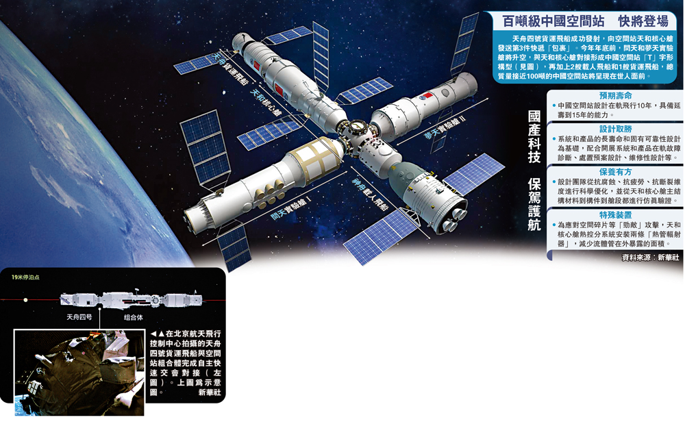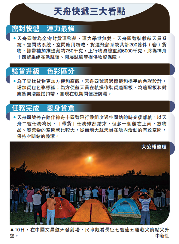 【大公報記者 劉凝哲北京報道】5月10日01時56分,隨着長征七號運載火箭托舉着天舟四號貨運飛船在文昌發射場點火升空,中國空間站全面建造階段的大幕正式拉開,這是中國空間站建造首次發射,也是空間站貨運系統第四次遠征。發射取得圓滿成功,這位「太空快遞」小哥成功對接空間站天和核心艙後向端口,其託運的200餘件(套)貨物重達6噸,為計劃於今年6月發射升空的神舟十四號飛行乘組3人「備足半年糧草」。太空「快遞」已送至,只待神舟「簽收人」。