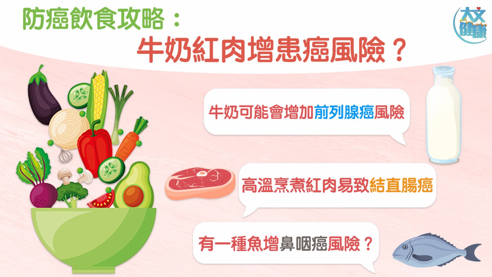 各種證據一致認為乳製品、牛奶、奶酪和膳食鈣的攝取量增加,結直腸癌的風險降低(強證據),乳腺癌的風險也可能降低(有限證據),但前列腺癌的風險可能會增加(有限證據)。