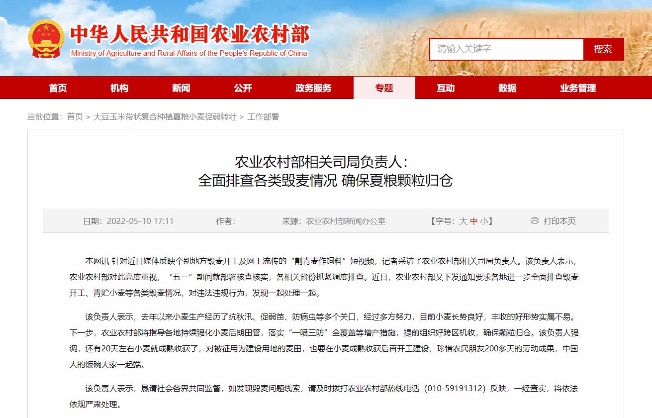 近日,農業農村部又下發通知要求各地進一步全面排查毀麥開工、青貯小麥等各類毀麥情況,對違法違規行為,發現一起處理一起。相關負責人表示,下一步,將指導各地持續強化小麥後期田管,落實「一噴三防」全覆蓋等增產措施,提前組織好跨區機收,確保顆粒歸倉。