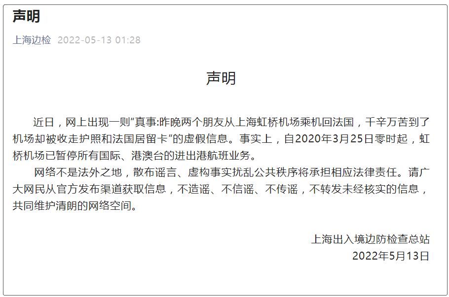 「上海邊檢」微信公眾號指,留意到近日網上出現一則「真事:昨晚兩個朋友從上海虹橋機場乘機回法國,千辛萬苦到了機場卻被收走護照和法國居留卡」的虛假信息。「上海邊檢」澄清表示,事實上自2020年3月25日零時起,虹橋機場已暫停所有國際、港澳台的進出港航班業務。