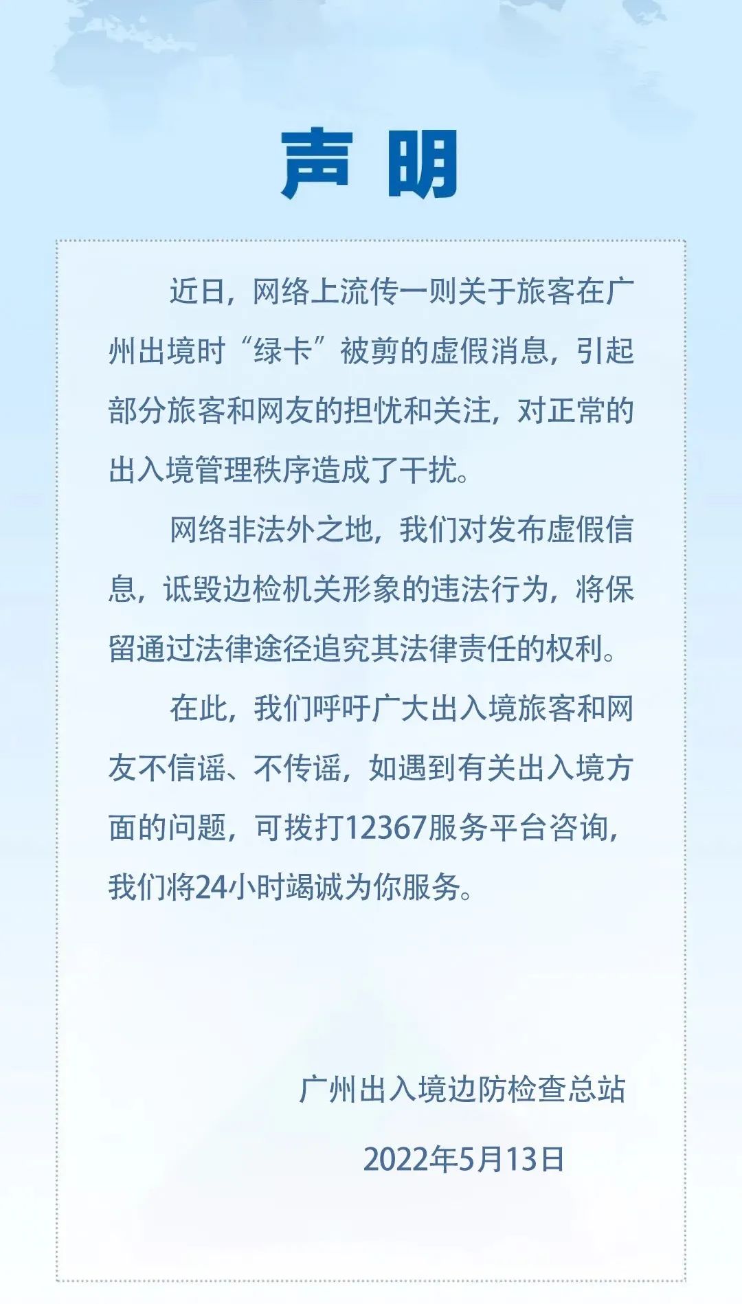 廣州邊檢總站則表示,近日網絡上流傳一則關於旅客在廣州出境時「綠卡」被剪的虛假消息,引起部分旅客和網友的擔憂和關注,對正常的出入境管理秩序造成了干擾。聲明指:「網絡非法外之地,我們對發布虛假信息,詆譭邊檢機關形象的違法行為,將保留通過法律途徑追究其法律責任的權利。」