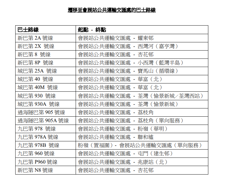 至於現時以該臨時交匯處作為總站的17條巴士路線,亦將於明日遷移至會展站公共運輸交匯處(見下圖)。此外,由5月15日起,新巴將開辦第1M號線(會展站公共運輸交匯處—黃泥涌峽(循環線)),提供往來會展站的接駁巴士服務;而與新鐵路服務範圍接近完全重疊的現有過海巴士第301號線(紅磡(海底隧道收費廣場)往上環)會被取消。