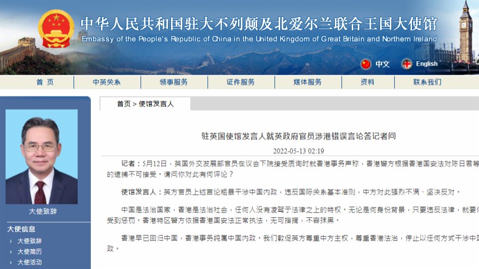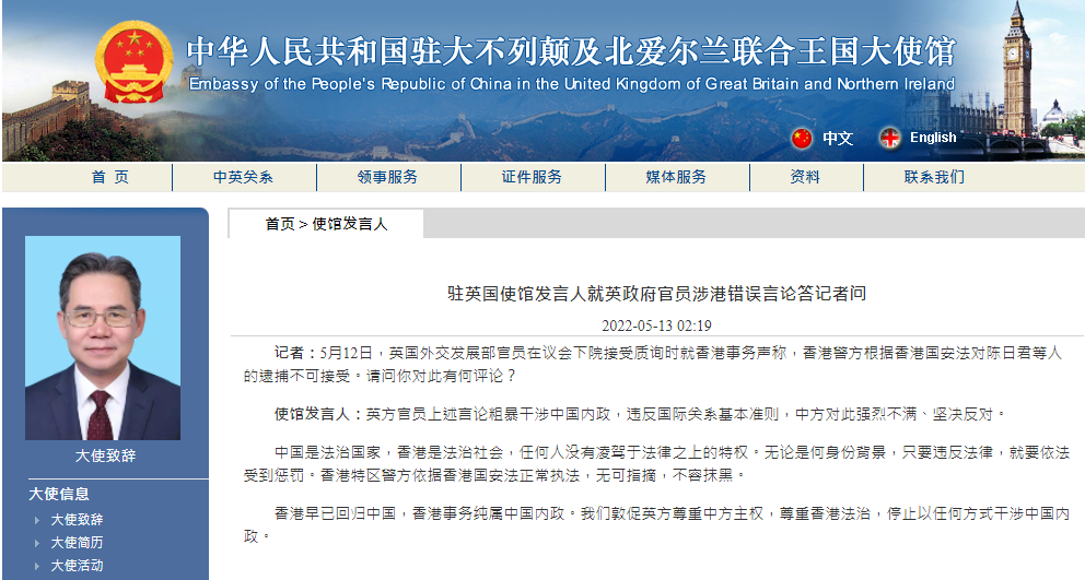 大公文匯全媒體報道,5月12日,英國外交發展部官員在議會下院接受質詢時就香港事務聲稱,香港警方根據香港國安法對陳日君等人的逮捕不可接受。中國駐英國大使館發言人昨日(13日)表示,英方官員上述言論粗暴干涉中國內政,違反國際關係基本準則,中方對此強烈不滿、堅決反對。