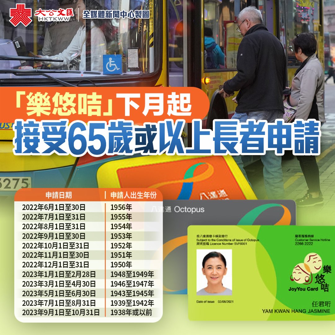 大公文匯全媒體報道,60歲或以上人士今年2月27日起,已開始使用登記個人資料的樂悠咭享有2元乘車優惠。而自2024年起,所有65歲或以上長者亦需換領有記名的樂悠咭,才能繼續享有2元乘車優惠。政府今日(16日)宣布,將會由今年6月1日起至明年10月底,分階段接受65歲或以上合資格香港居民申請「樂悠咭」,以繼續享用2元乘車優惠。