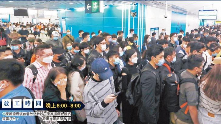下午6時至8時放工時間,人潮再現,金鐘站開往上水方向的東鐵線,雖班次已加密至兩三分鐘一班,但仍有不少乘客擠不入車廂內,要等兩班車才擠上車。