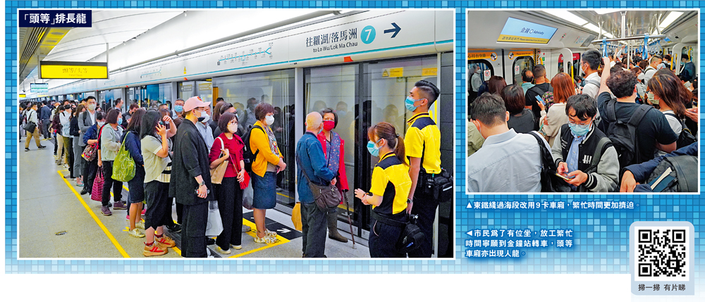 【大公報記者 司徒志雄(文) 林少權、麥潤田(圖)】東鐵綫過海段通車後迎來首個上班日,運作大致暢順;然而隨着東鐵綫過海段通車,交通網絡勢必再度洗牌。大公報記者昨日傍晚分別在金鐘站及紅隧巴士站實地觀察,發現金鐘站前往東鐵綫過海段的月台被擠得水洩不通,連頭等車廂乘客也要「爭櫈坐」;相反紅隧口巴士站人流明顯減少。
