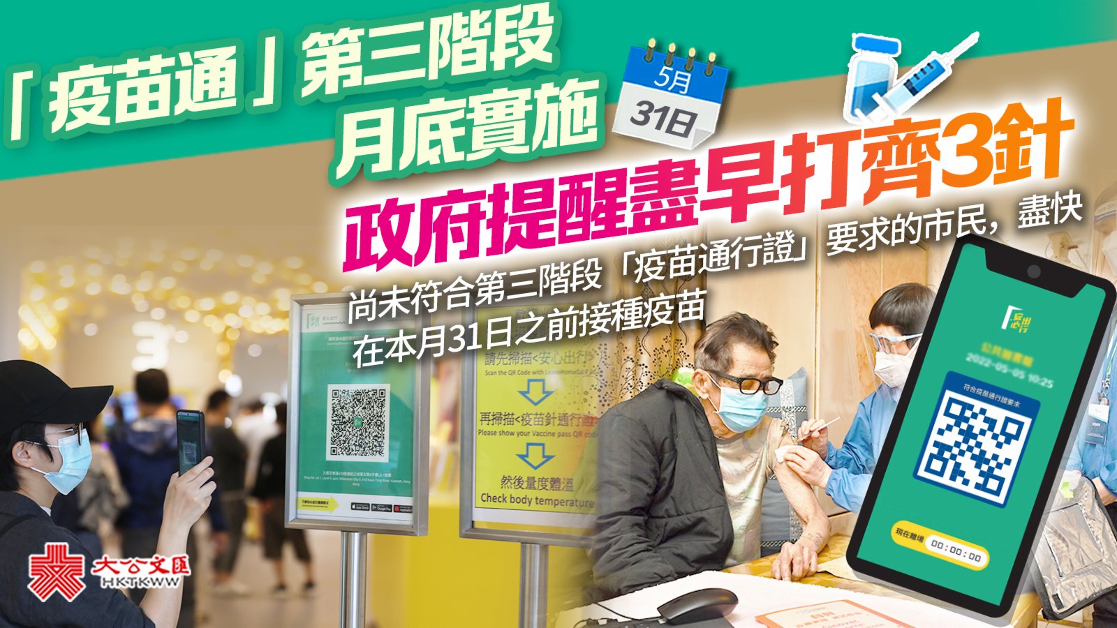 大公文匯全媒體報道,第三階段的「疫苗通行證」將由月底(31日)起實施,屆時所有12歲或以上的市民,除非取得新冠疫苗接種醫學豁免證明書,必須按要求接種新冠疫苗,方能符合「疫苗通行證」的要求。政府今日(17日)提醒市民,尚未符合第三階段「疫苗通行證」要求的市民,盡快在本月31日之前接種疫苗。政府亦呼籲其他合資格接種第三劑疫苗的市民,無需等候至「疫苗通行證」6個月寬限期屆滿,應盡早接種第三劑疫苗。