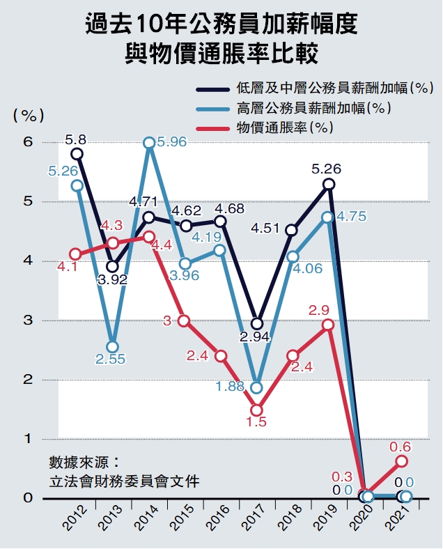【大公報記者 常彧璠、義昊、黃釔淼】影響公務員調薪幅度的「薪酬趨勢調查」結果昨日出爐,今年的「薪酬趨勢總指標」高層公務員為8.3%、中層公務員為5.58%、低層公務員為3.2%。經扣除遞增薪額開支,高層公務員薪酬趨勢淨指標為7.26%,創回歸以來新高,中層公務員為4.55%,低層公務員為2.04%。