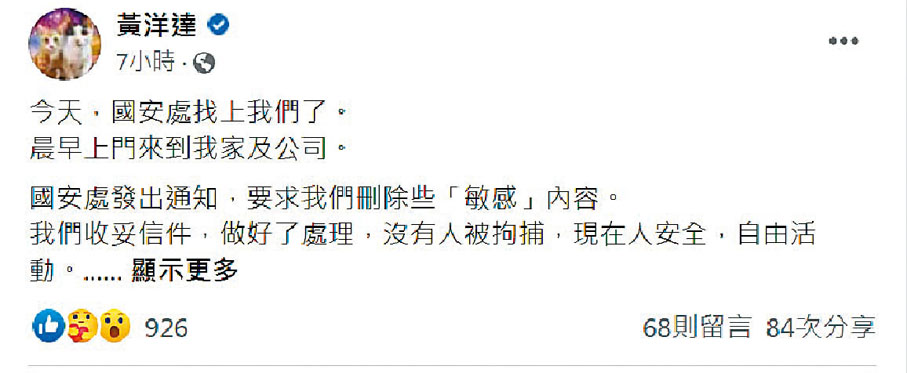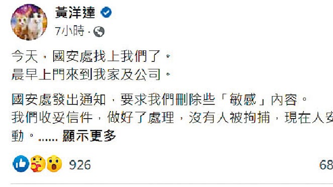 黃洋達昨晨在其個人Facebook專頁貼文稱,警方國安處人員到其寓所及位於九龍灣的公司送交通知,要求刪除一堆網站、社交媒體等「敏感」內容,並設有限期及條件。他昨日在回覆傳媒查詢時稱,「按照要求已經處理。」