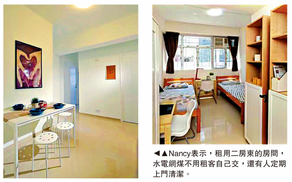 Nancy表示,不論對於初來香港的學生還是忙碌的港漂上班族,二房東旗下的房屋相比外面的房屋而言,要讓租客省心得多。「初來港時語言不通、人生地不熟,找房產中介又怕遇到黑中介、黑業主,水電網煤費用又不知道去哪裏交,連配個鑰匙也要找半天,這類雜事其實很繁瑣。」