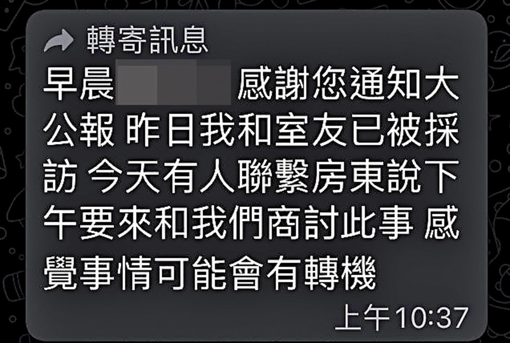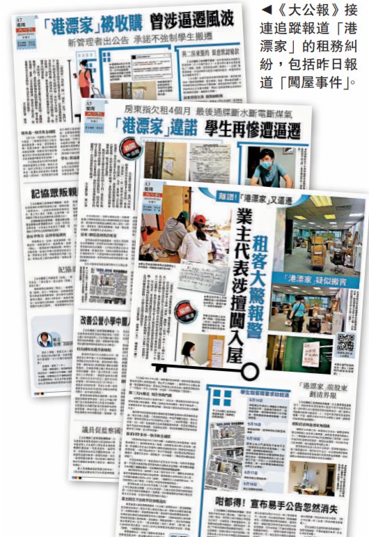 但自從《大公報》介入後,不少同學有了信心,過去報道中提到的受害者,幾乎都不用被逼遷了。這次涉擅闖入屋逼施同學等人三天之內搬走的業主,在見報後已表示不會如期(18日)上門收樓。同學們很感動:「爸爸媽媽這幾天都睡不着,擔心我們安危!我們也是不知所措,好在有《大公報》!很感謝!」