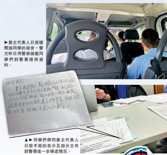 昨天是業主提出三天收樓最後通牒的最後一天,為了安全起見,施同學和室友於昨日下午換了門鎖,隨後接到西區警署的電話,邀請她們去警署進一步陳述情況。施同學等人昨在警署逗留了四個多小時,她說,警方告知她們案件分配到第五隊,將按刑事方向去調查。警方亦向她們表示,已聯繫港漂家,告知港漂家不能再讓業主和中介來騷擾租客的生活,讓同學們安心在原住處住到7月。「但不知道我們之前交給港漂家的押金怎麼辦?還能不能退回來?我們之前是交了兩個月的押金。」施同學心有餘悸。
