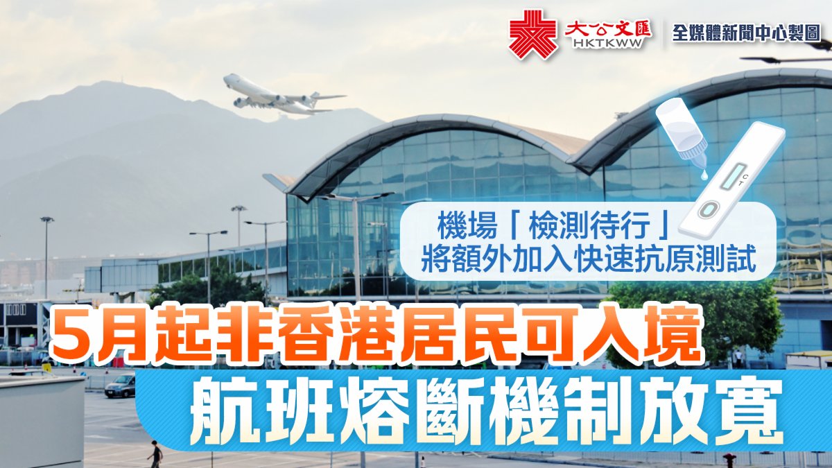大公文匯全媒體報道,第五波疫情持續緩和,特區政府周五4月22日宣布,從5月1日起放寬入境防控措施,包括取消非香港居民的入境限制,以及放寬現行航線熔斷機制的觸發指標,同一航班至少5名乘客或5%乘客染疫才需停航,禁飛期亦由7天縮短至5天。