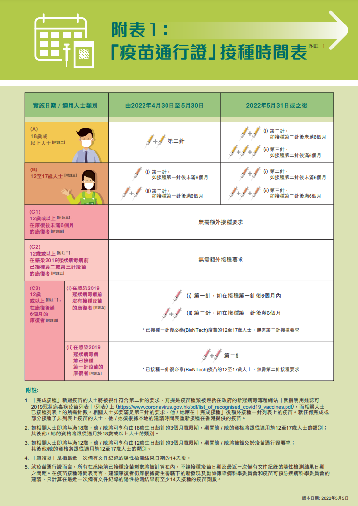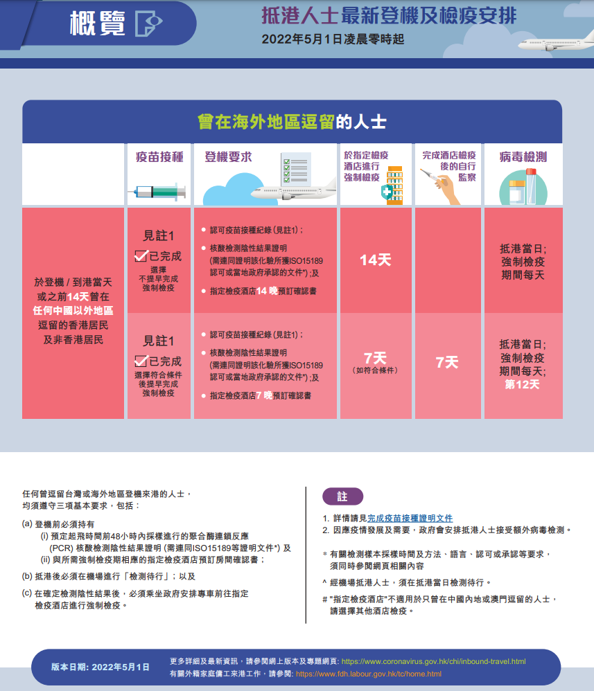 溫馨提示:自5月31日起,12歲或以上人士入境香港須已接種最少兩劑疫苗,如已接種第二劑疫苗滿六個月,則須已接種第三劑疫苗(接種完第三針後滿14天才能入境)。