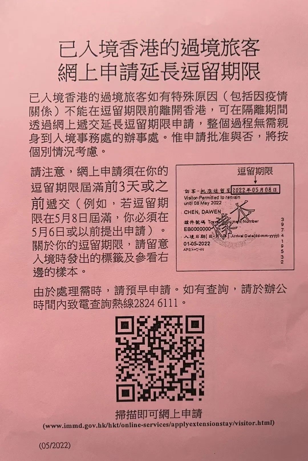 其實特區政府對這個情況已作出應對,如果隔離7天後不能離境,因任何合理理由,比如探親、護照丟失,檢測陽性,訂不到深圳隔離酒店都可以申請延期,只需要在網上做簡單的登記,港幣230元就可以提交續期申請,申請表裏面需要填寫一位在香港的聯繫人作為擔保。