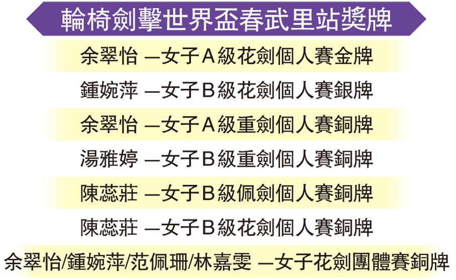 (香港文匯報記者 黎永淦)輪椅劍擊世界盃泰國春武里站周日(22日)煞科,香港隊再憑余翠怡、鍾婉萍、范佩珊及林嘉雯合作,在女子花劍團體賽銅牌戰勇破泰國隊,為香港再奪一面銅牌。總結今站賽事,港隊共斬獲1金1銀5銅共7面獎牌,當中余翠怡以1金2銅成為大贏家。