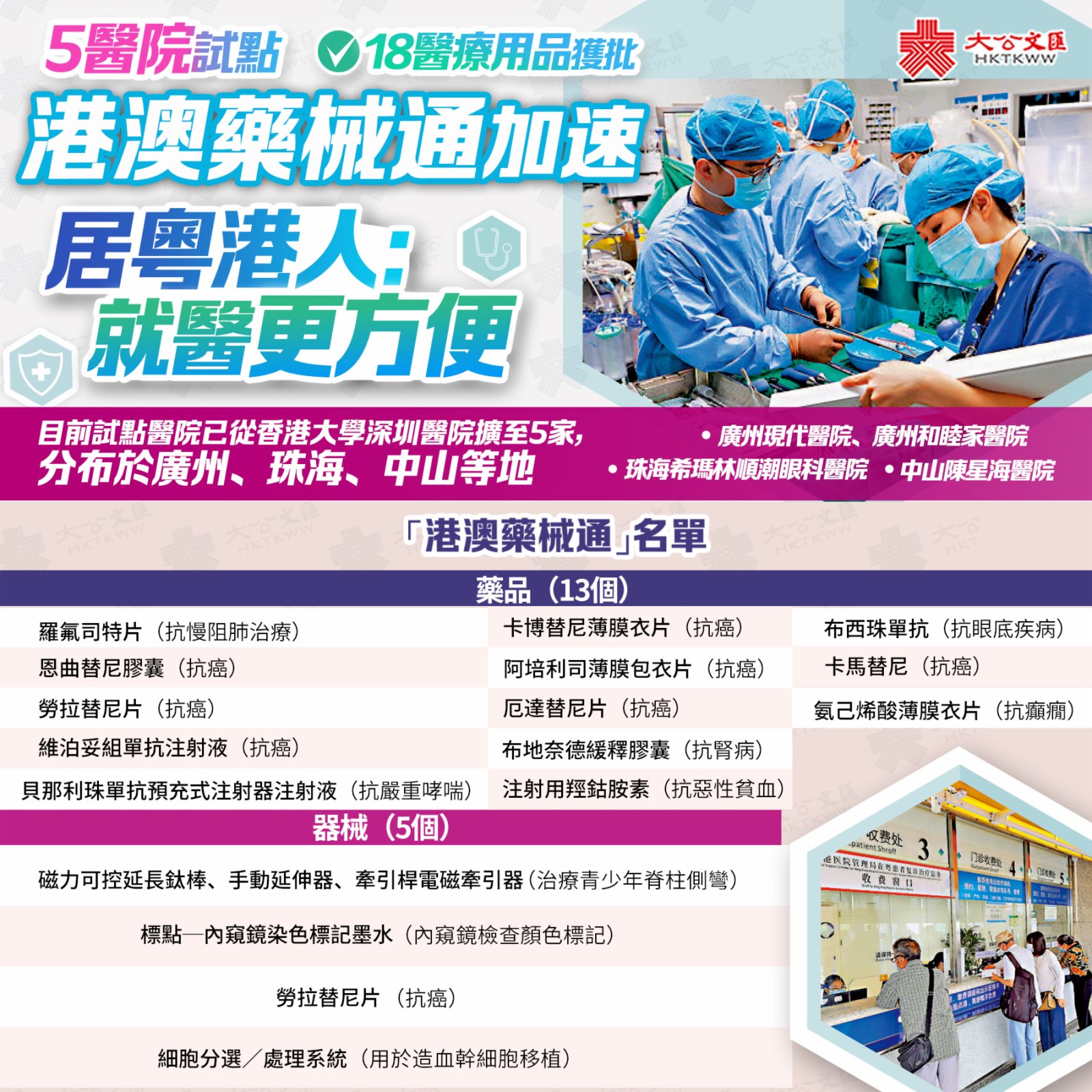 據了解,「港澳藥械通」政策允許已在港澳上市、公立醫院普遍採用、屬於臨床急需或內地需要的藥物及醫療器械,通過試點醫療機構申請進口,目前試點醫院已從香港大學深圳醫院擴至5家,分布於廣州、珠海、中山等地。