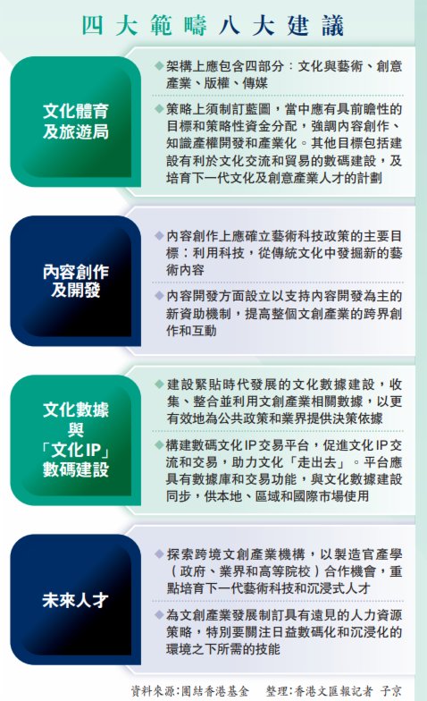 團結香港基金昨日線上發布有關研究報告,就如何強化香港的文化實力和數碼產業作全面剖析,並在四大範疇提出八大建議。