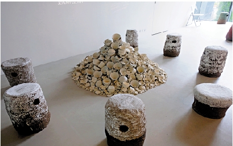 看罷大型裝置,拾級而上,是展示「貳零貳貳同學會」的藝術空間,該空間匯聚十二位本地藝術家作品,為期六個月的展覽期間每兩周就會換一位「空間話事人」。首期「當值」的是林嘉欣,因她學習陶藝的緣故,現場可見大量陶土元素。其展品旁,豎立着一排排圖書館的書櫃,觀眾可拉開書櫃觀賞展品,一眾藝術家藉此說明知識儲備的重要性。