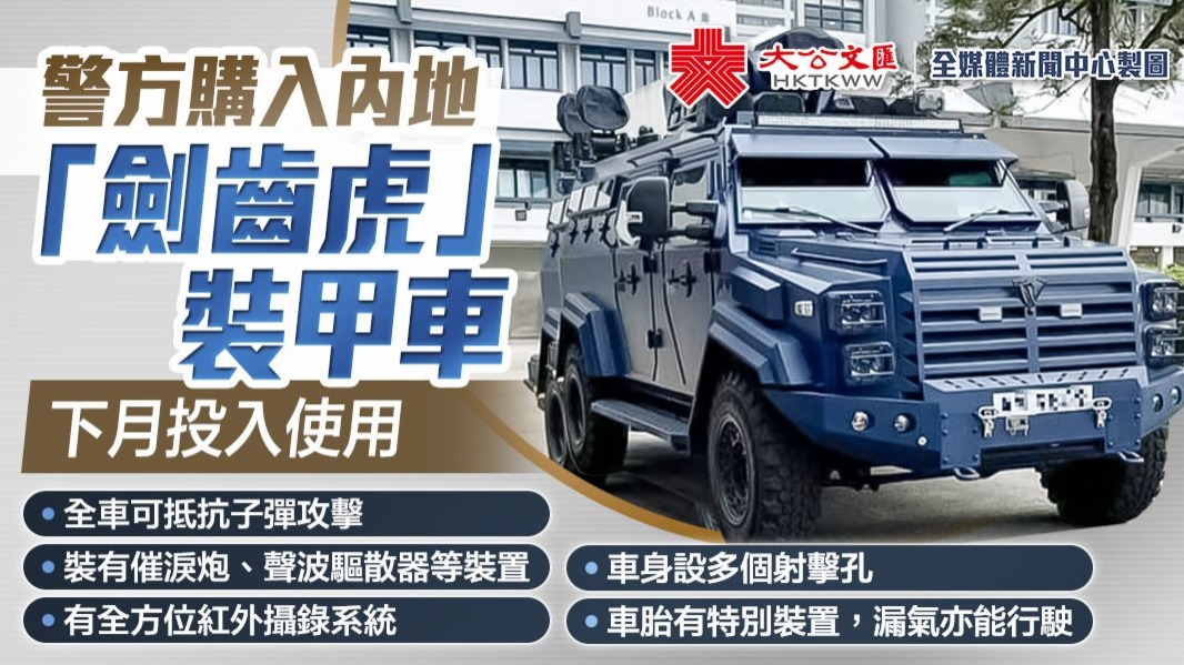 大公文匯全媒體報道,警方購入由內地製造的裝甲車,機電署上月已完成測試,警隊正進行內部培訓和資格認證,預料下月可正式投入使用。