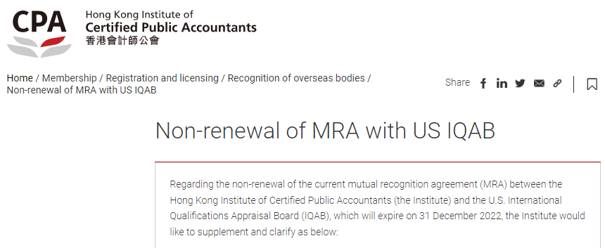 大公文匯全媒體報道,香港會計師公會早前公布,與美國國家會計委員會全國協會(IQAB)的互認協議,將於2022年12月31日到期。