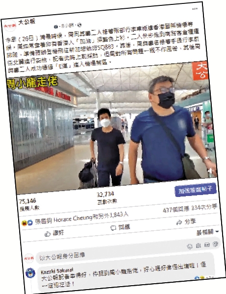【大公報記者 趙明新、施文達(文) 調查組、突發組(圖)李斯達(資料)】周小龍和妻子乘搭新航飛往新加坡,再轉機至美國。記者上前追訪,周小龍耷頭迴避,更用登機證遮掩樣貌,耍賴問機場職員是否有保安。及後周小龍回覆其他媒體聲稱「一定會返香港」。不過他離港前在社交媒體上載當年結婚照及童年照緬懷,又表明童裝生意正在結業。