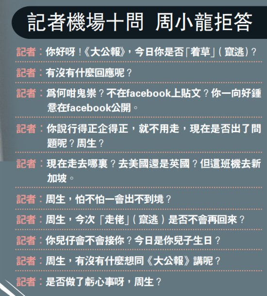大約中午12時45分,周小龍與妻子各拖着手提行李篋走往北翼進行安檢,記者此時上前追訪周小龍,問:「你今日係咪着草老佬,點解走得咁鬼祟?你話行得正、企得正唔使走,係咪而家有問題?今次走佬係咪唔返嚟?而家走佬去邊?英國還是美國?」不過,周小龍對以上問題一概不答,「頭耷耷」不斷加速腳步。記者再問他會否擔心不能成功出境時,周小龍耍賴大聲叫:「有無security(保安)?」再急步走向「E道」。